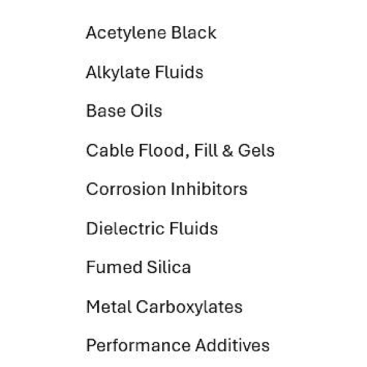 Acetylene, Black Alkylate Fluids, Base Oils, Cable Flood Fill & Gels